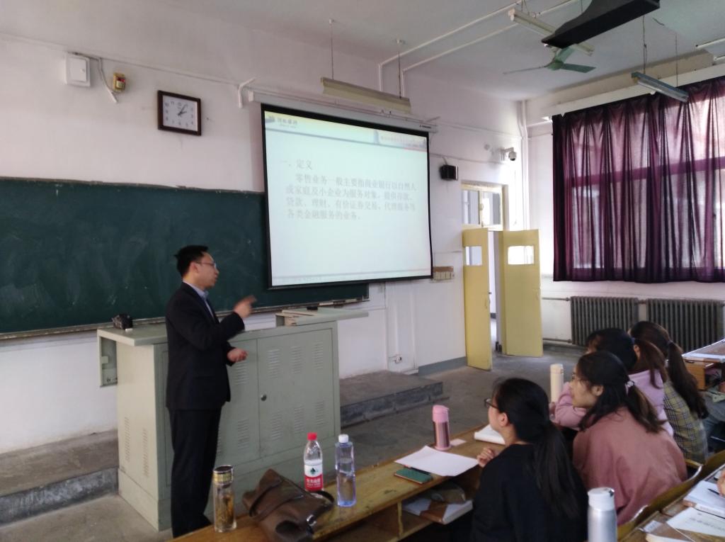 “行长进课堂”——河北银行无极支行赵彬行长在给同学们讲授商业银行零售业务