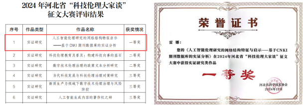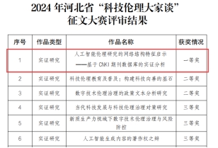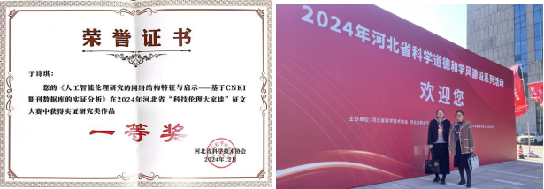 教授雷娜与研究生于诗琪合作撰写的文章《人工智能伦理研究的网络结构特征与启示——基于 CNKI 期刊数据库的实证分析》荣获河北省科协组织开展的2024年河北省“科技伦理大家谈”征文大赛实证研究类一等奖。本次大赛经组织申报、内容审查、专家评审、社会公示等环节,共评选出“科技伦理大家谈”优秀作品48篇,其中,实证研究类征文设一等奖1项,二等奖2项,三等奖3项,优秀奖若干项。