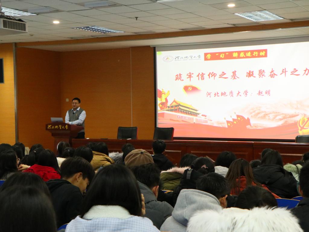 为深入学习贯彻习近平新时代中国特色社会主义思想和党的十九届四中全会精神一步加强学生思想政治教育工作引导学生扣好人生第一粒扣子根据教育厅《关于在全省高校2019级新生中开展“解惑”活动的通知》,经贸学院12月17日组织2019级新生开展“解惑”宣讲活动。邀请河北省高校精英辅导员河北省高校骨干辅导员赵明老师在北校区401为经贸学院全体大一新生进行题为《筑牢信仰之基  凝聚奋斗之力》宣讲。