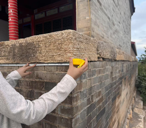 实践过程中,小分队采用“文献研究+实地考察+问卷访谈+云端协作”的多元调研方法。一位队员奔赴史家堡村实地调研,手持卷尺穿梭于古建筑间,细致测量建筑尺寸,记录结构特征,建立起包含建造年代、结构特征、损坏程度的详细档案。同时,在史家堡村的街巷间开展问卷访谈,向过往村民和游客发放调查问卷,了解他们对古建筑保护与开发的看法及诉求,“古建筑活化能否提升收入”“是否愿意参与旅游经营”等问题成为调研的重点,村民们和游客们积极分享自己的想法,不少村民表达了对通过古建筑开发增加就业机会的期待。