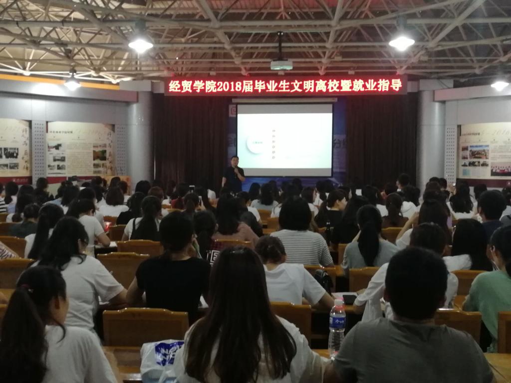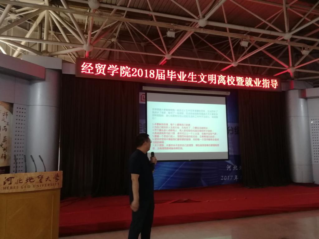 2018年5月16日,经贸学院赵明老师组织2014级全体毕业生在科技报告厅召开“毕业生文明离校暨就业指导”会议。会议主要内容围绕毕业生近期安排、协议书讲解、报到证讲解和注意事项四个方面。会议上,赵明老师将毕业生近期毕业照、实习日志和毕业论文、学分问题、体检、毕业典礼、毕业生文明聚会等进行条例安排和经验分享,仔细讲解毕业生协议书、灵活就业表和报到证的填写和保留,其中重点强调“就业报到证”的重要性和实际工作中的作用。此外,安全问题始终是赵明老师毕业生工作的重点,会议上老师强调毕业生安全问题,包括人身安全、财产安全、防火防盗、聚会饮酒问题,尤其是防传销方面。