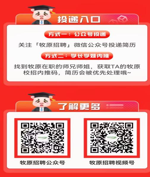 养殖类、饲料类、屠宰类、智能技术类、管培生,共计100+岗位,更多详情可关注牧原微信招聘公众号了解。