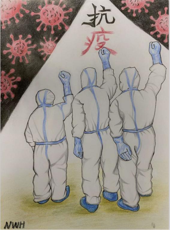 全体党员将自身的热血与决心以书法、绘画的形式呈现于纸面上,用自己的方式表达着对抗疫医护人员的敬意以及抗疫必胜的决心。