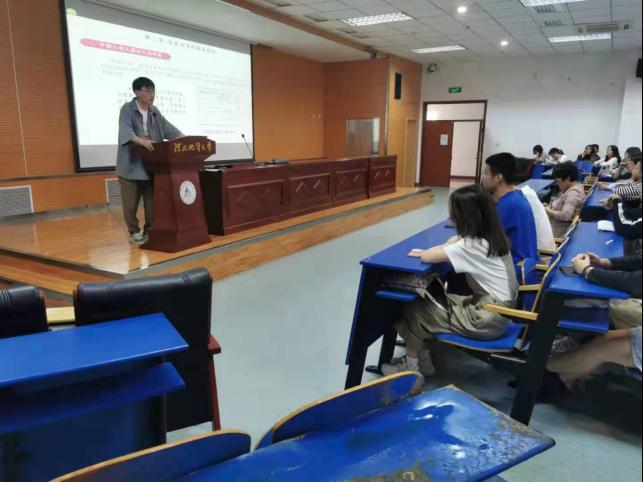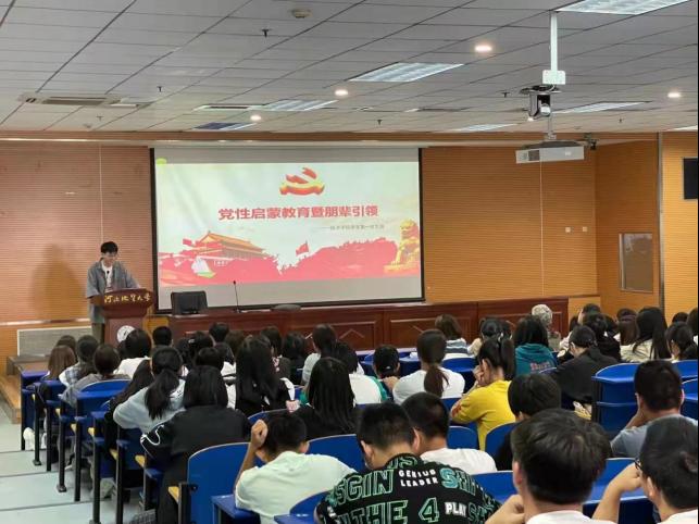 学生第一党支部书记蔺丽军老师和沈敬然、赵通帅、刘蔼萱和竹新奥四名优秀党员为2021级全体新生召开党性启蒙教育大会。