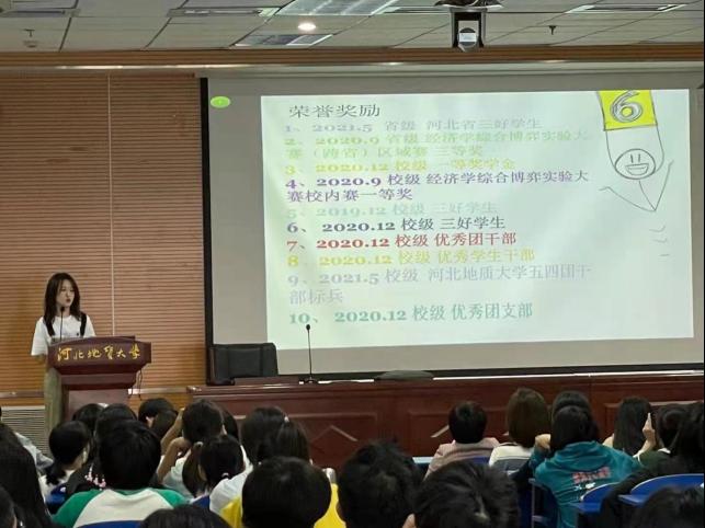2018金融学专业沈敬然同学以“端正入党动机争做合格积极分子”为主题,认真学习中国共产党指导思想,从自己入党的初心谈起,提出新时期大学生入党要求,来端正同学的入党动机。2018级校学生会主席赵通帅同学以“征途慢慢唯有奋斗”为主题,从参加社会实践活动到备考研究生的准备谈起,让2021级新生有效规划的大学四年生活。2019级金融学专业竹新奥同学从大学生竞赛类别谈起,结合自己参加竞赛经历,让2021级新生平衡大学四年生活,做优秀大学生,做社会主义接班人。2018级经济学专业刘蔼萱同学以近期的个人求职体验为例引入话题,分享了自己求职中遇到的问题和个人见解,从大学一年级开始规划自己未来职业生涯。