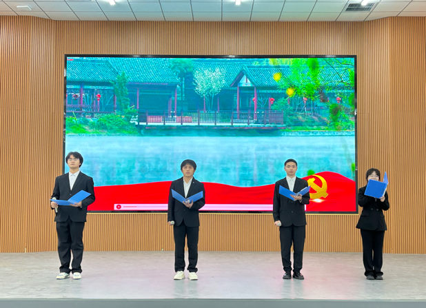 活动进入高潮,全场师生起立齐唱《没有共产党就没有新中国》,嘹亮的歌声铿锵有力,回荡在活动现场,凝聚起全体师生坚定不移跟党走的信念与决心。在领誓人袁萌晨的带领下,现场全体师生举起右拳庄严宣誓,铮铮誓言铿锵有力,字字千钧,彰显了传承红色基因、勇担时代使命的坚定决心。随后,学院为获评“共产党员示范岗”“党员模范宿舍”“团员模范宿舍”的先进个人与优秀集体隆重颁发证书与旗帜,现场掌声雷动,氛围热烈。