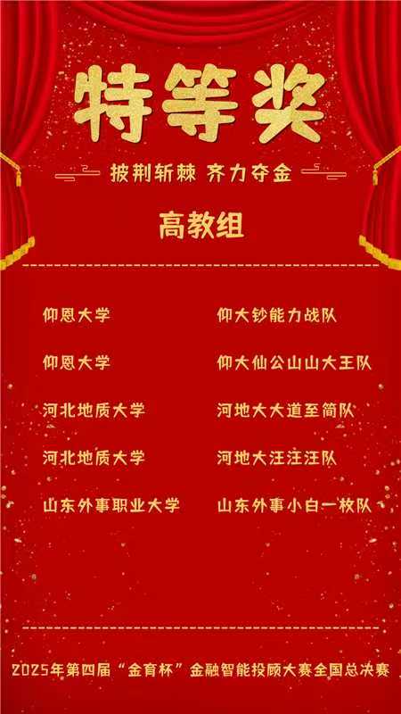 2025年11月15日,在第四届“金育杯”金融智能投顾大赛全国总决赛中,肉视频2支代表队(指导教师:孟亚君、庞岩、田杰)分别取得团体总分第三名和第四名,双双荣获高教组全国特等奖,其中郎潘依同学获得个人赛项最佳投资顾问奖,时浩和王文涛等七位参赛同学荣获个人赛项十佳投资顾问奖。